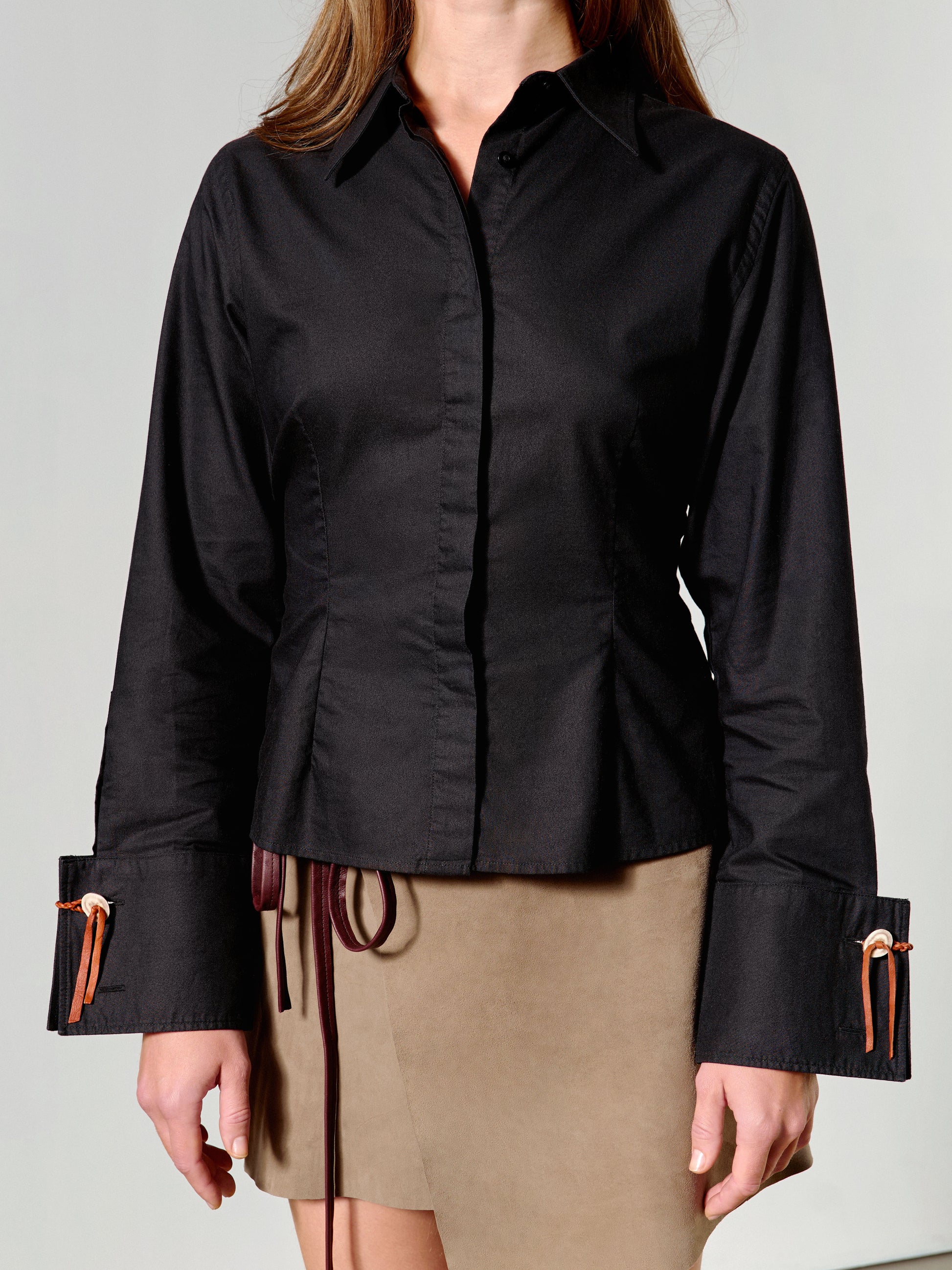 The Áhkku shirt features a cinched, feminine silhouette — fitted at the waist and cut to hip length. Crafted from a medium-weight cotton fabric, it’s finished with two distinctive cufflink buttons, handmade by our father from reindeer antler and reindeer leather.